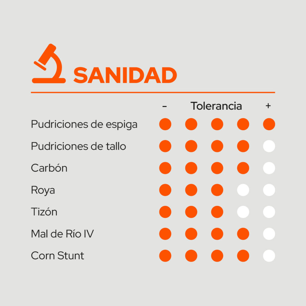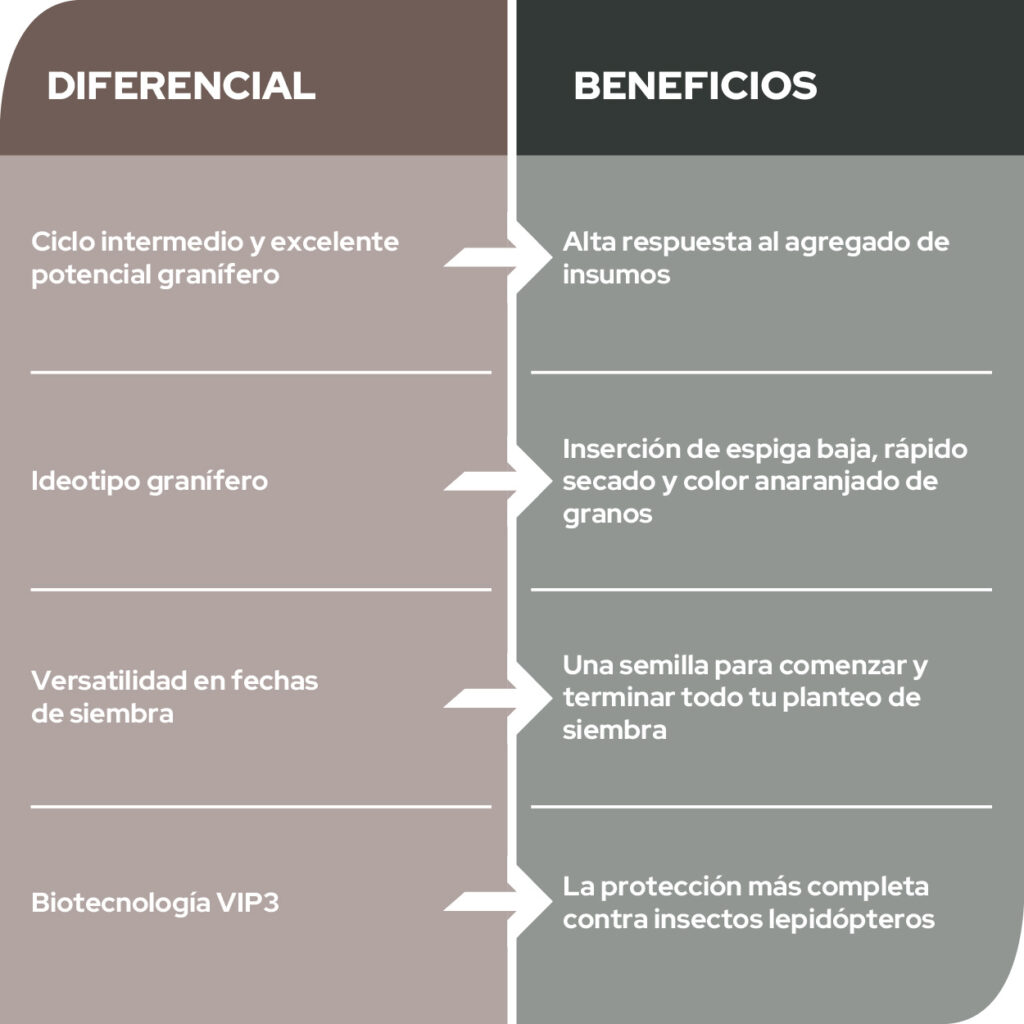 Es el híbrido con la mejor relación ciclo/rendimiento del portfolio. Por largo de ciclo y perfil sanitario puede sembrarse en fecha temprana y tardía. Recomendado para productores que buscan alto rendimiento en grano o también para planteos de estabilidad, necesitan versatilidad en fechas de siembra y tolerancia a estrés.