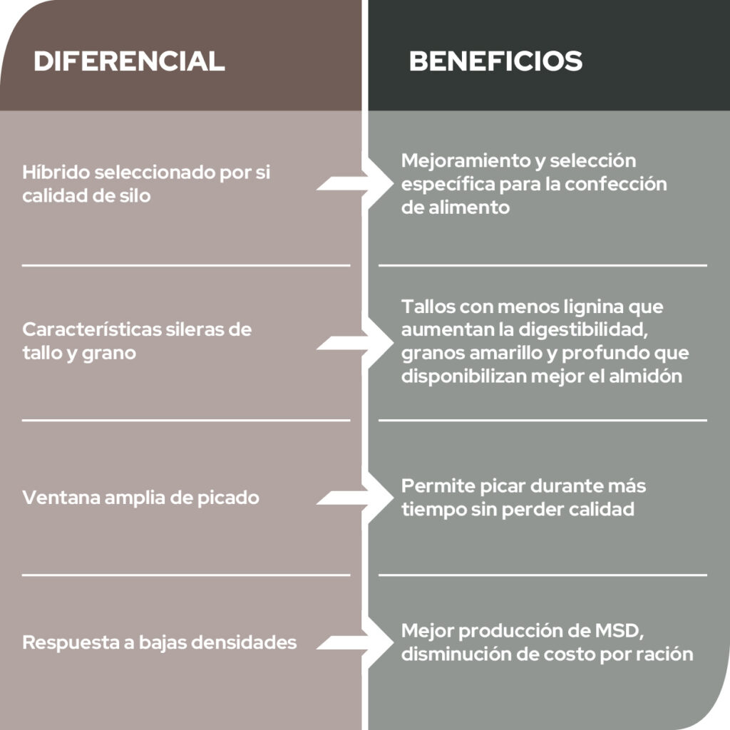 Por su alta producción de materia seca digestible, alto rendimiento en grano y calidad de la fibra es un híbrido de “Aptitud Silera” por excelencia. Adaptado a siembras tempranas de todo el país, se destaca por alcanzar altos rendimientos aún en densidades medias en ambientes restrictivos. Recomendado para productores que planean silos de alta calidad.