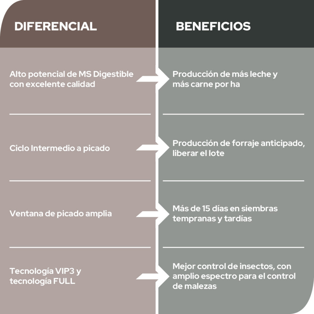 Es un híbrido con muy alto potencial y producción de materia seca digestible. Su ciclo intermedio a picado permite cosechar su calidad tanto en siembras tempranas y tardías. Posee una amplia ventana de picado. La tecnología VIP3 FULL le otorgan la mejor protección contra insectos y un mejor manejo de malezas