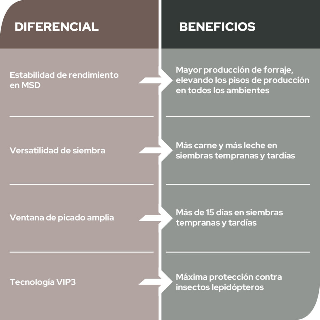 Un híbrido con excelente estabilidad y buena productividad de materia seca digestible en siembras tempranas y tardías. Posee amplia ventana de picado. Con tecnología VIP3 que le confieren mayor protección de planta y espigas. Recomendado para aumentar la producción de más leche y más carne.